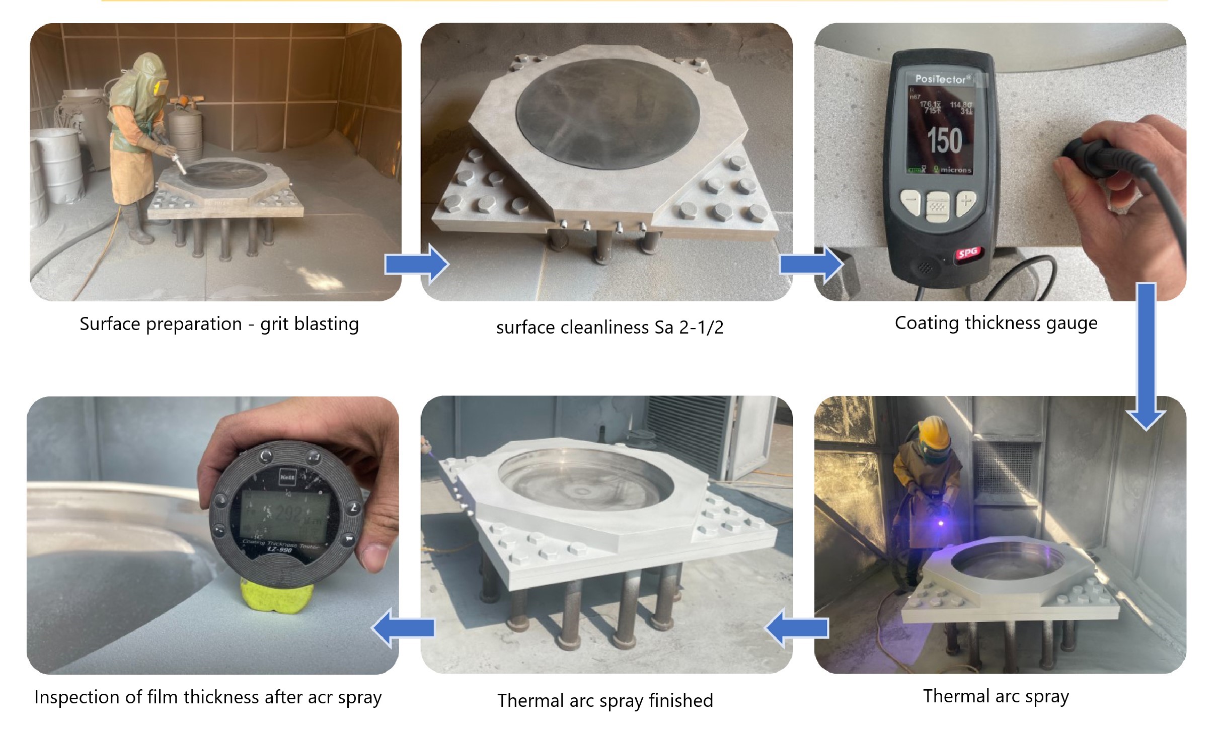 - The applied top coating after arc spray not only repairs the surface but also enhances the hardness and abrasive resistance as a result to extend the service life.