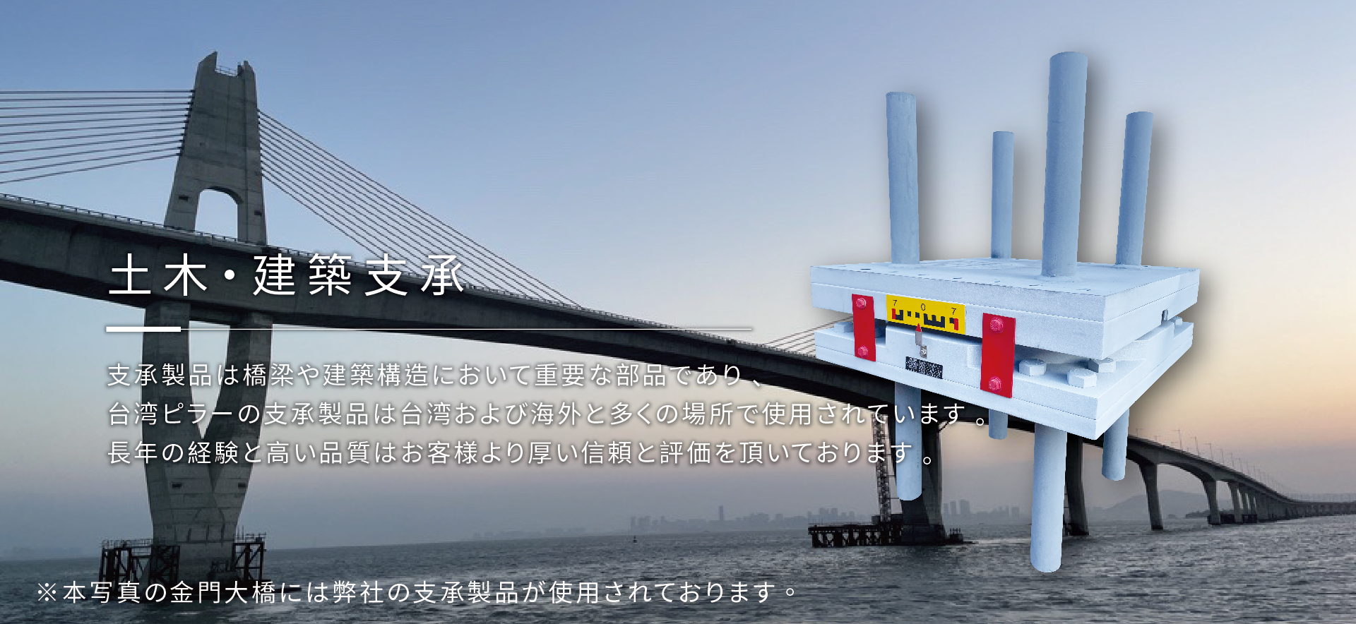 またピラー台湾株式会社独自の製品としまして土木・建築用支承があり、前身である台日合弁企業設立1996年以来、設計から製造、販売まで一貫して行っており、台湾新幹線やMRT桃園空港線などを